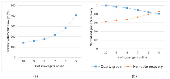 Figure 9a highlights the increasing volumetric flow rate of the recirculating stream (scavenger concentrate) as the overall scavenger residence time is decreased. This increases the volumetric feed to the mainline which leads to a decrease in the residence time within the mainline. The resulting improvement in quartz and hematite behavior is seen in