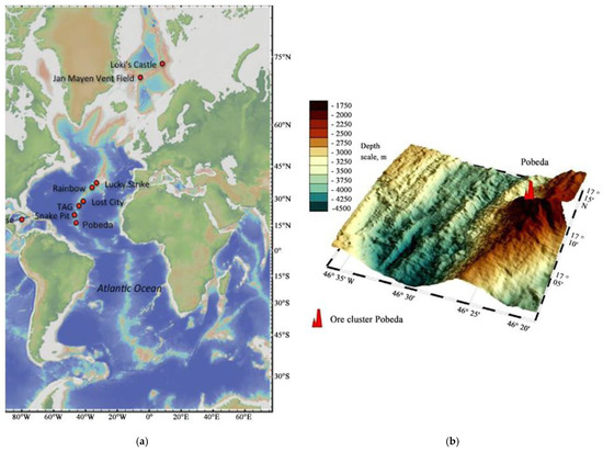 The Pobeda ore cluster’s location among the known hydrothermal fields at the Mid-Atlantic Ridge (a) and scheme of the rift valley (b) (https://motherboard-images.vice.com/content-images/contentimage/14339/1407427503312474.jpg, accessed on 31 May 2021).