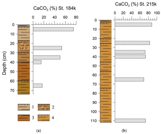 Lithology and the CaCO3 contents in sediment cores 184k (a), and 215k (b). Legend: 1—coccolite-foraminiferal, light-brown soft ooze, with sandy admixture; 2—coccolite-foraminiferal, light-brown, dense, silty-pelitic ooze, with bioturbation patches; 3—homogenous coccolite-foraminiferal, dark-brown silty-pelitic ooze; 4—homogenous coccolite-foraminiferal, light-brown, dense, silty-pelitic ooze with sandy admixtures.