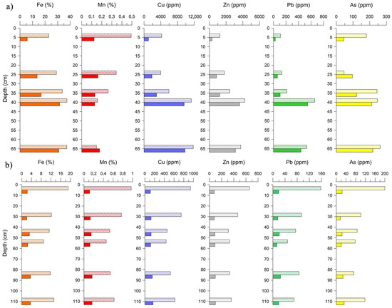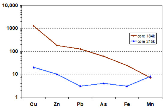 The most contrasting metal enrichment of core 184k was detected by using the enrichment factor EF = (Eli/Al)sample/(El/Al)UCC, where (Eli/Al)sample—ratio of the average contents of the i-element and Al in sediment sample, (Eli/Al)UCC—the same for the Upper Continental Crust [42]. In the ore-bearing core 184k, the maximal EF was calculated for Cu (1270), while for the rest of metals EF values were much lower: 180 (Zn), 125 (Pb), 60 (As), 24 (Fe) (Figure 3). The background core 215k is also enriched in metals relatively UCC, however, its EF values are significantly lower. Note that Mn is the only metal whose EF values were the same (EF = 8) for in both sediment cores.