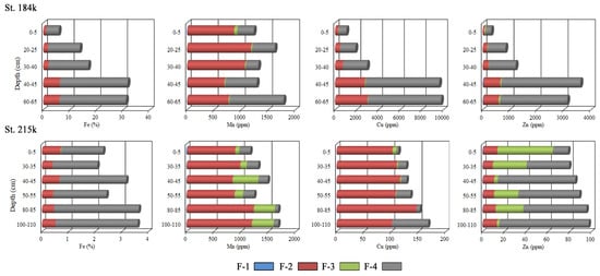 Geochemical fractions of metals in the metalliferous (St.184k) and background (St. 215k) cores. Fractions: F-1, exchangeable elements adsorbed mainly onto the clay and carbonate particles; F-2, authigenic Fe-Mn hydroxides and related trace elements; F-3, bound to organic matter or sulfides; F-4, refractory, metals fixed in crystalline lattices of mineral particles.