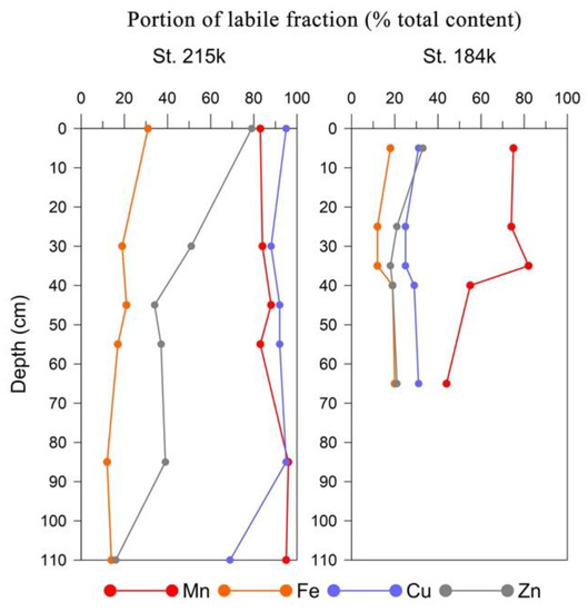In the background core 215k, a distribution patterns of metal geochemical fractions differ a little from those in the bottom sediments of the subarctic White and Arctic Barents Seas [48,49,50,51], as well as in the oxidized sediments of the Black Sea [52]. Manganese being a redox sensitive element in various geochemical environments, proved to be the most labile metal, whose sum of labile fractions is about 60% on average from its total contents.