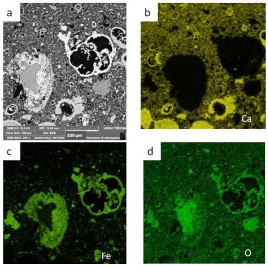 The SEM images of core 184k, the sediment layer of 65–70 cm; (a) back scattered electrons’ image; b–d, maps of the element distribution: (b) Ca; (c) Fe; (d) O.