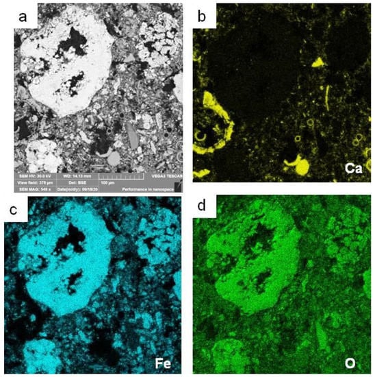 These particles by shape and size (to 0.2 mm) (Figure 7a and Figure 8a), as well as by Ca and oxygen distribution maps (Figure 7b,d and Figure 8b,d), correspond to that of foraminiferal CaCO3 tests. The Fe and oxygen distribution maps (Figure 7c and Figure 8c) depict a calcite foraminiferal shell shape, while those of Fe and Ca exhibit an inverse picture. These data support our suggestion about a substitution of Ca in foraminiferal tests with Fe oxyhydroxides, mainly goethite.
