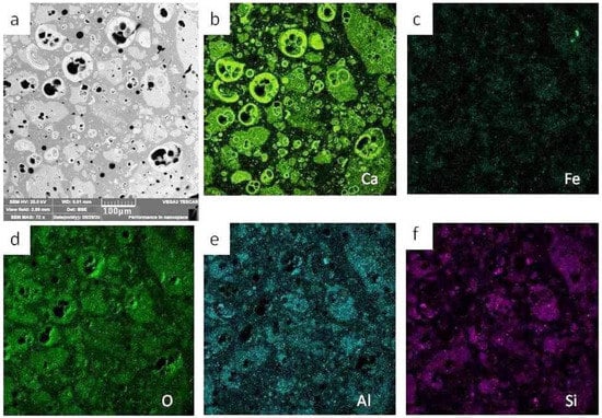 At the same time, in the background core, 215k, at the depth of 100–110 cm, distribution maps exhibit a clear association of Ca (Figure 9a,b) and oxygen (Figure 8d) with foraminiferal tests, while for Fe, no such a relation was observed (Figure 9c). Angular and irregularly shaped lithogenic particles (fragments of aluminosilicates) are traced by oxygen (Figure 9d), as well as by Al and Si (Figure 9e,f respectively).