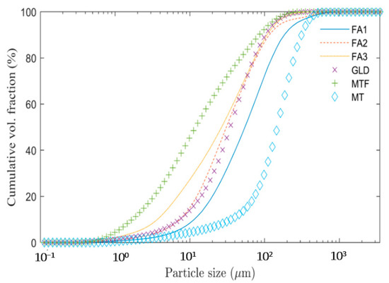 Particle size distributions and specific surface areas of the samples are shown in Table 3 and Figure 1. MTF contains the finest particles with FA3, while MT were found to consist of coarser particles leading to a smaller specific surface area. Interestingly, FA2 has a smaller surface area than FA1 considering its fine particle size distribution. Similarly, the specific surface area of MTF was found to be very small despite its fine particle size distribution. A possible explanation for this might be the smaller amount of carbon present in this sample compared to the others, as the correlation between the specific surface area and unburnt carbon content is widely acknowledged [30]. It seems also possible that, FA1 might contain higher number of porous, or generally more porous, particles compared to FA2, resulting a higher specific surface area than FA2.