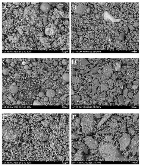Sample morphologies determined with SEM are shown in Figure 2. The relative Al and Si concentrations of the samples are presented in the mappings (Figure S1). Figure 2A–C present biomass fly ash and coal fly ash samples. These samples consist of irregularly-shaped, hollow and spherical particles (cenospheres), which have been observed in other studies [5,35]. The dark and irregularly shaped particles seen in coal fly ash, for instance in the centre of Figure 2C, are likely related to unburnt carbon, which is an inference supported by the high carbon concentrations obtained by the EDS analysis (Table 5). Figure 2 shows that fly ashes (Figure 2A–C), GLD (Figure 2E) and MTF (Figure 2F) consist of particles with smaller sizes compared to the other samples. On the other hand, BA (Figure 2D) and MT (Figure 2G) contain large, square and irregularly-shaped particles. Of the two different zones of the SS (Figure 2H), the lighter zone is considered to contain high concentrations of iron, while calcium is thought to be present at high concentrations in the darker zone [27].