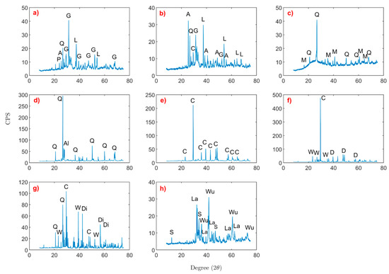 The XRD patterns of the samples are shown in Figure 3. Both FA1 (Figure 3a) and FA2 (Figure 3b) contain anhydrite (CaSO4), gehlenite (Ca2Al2SiO7), lime (CaO) and quartz (SiO2). In addition, FA1 contains portlandite (Ca(OH)2), whereas it is replaced with calcite (Ca(CO)3) in FA2. These findings are consistent with those of other studies [18,41,42]. According to Figure 3c, FA3 contains mullite (Al6Si2O13) and quartz (SiO2), whose presence has been reported previously [17]. As can be seen in Figure 3d, the biomass bottom ash consists of quartz (SiO2) and albite (NaAlSi3O8) while the main crystalline phase detected in dregs (Figure 3e) was calcite, which agrees with the previous investigations [5,40] and the high content of CaCO3 observed in the XRF analysis (Table 6). Limestone tailings show a slightly different crystalline structure: MTF (Figure 3f) contain calcite, dolomite, wollastonite, while quartz, diopside (MgCaSi2O6) and wollastonite (CaSiO3) were observed in MT which reflects the other studies [43]. Steel slag (Figure 3h) contains larnite (β-Ca2SiO4), wustite (FeO) and srebrodolskite (Ca2FeAlO5). The presence of larnite and wustite in EAFSS was previously noted by other studies [27,29].