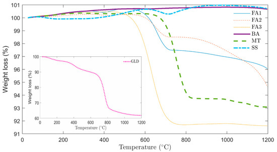 The weight losses occurring after 700 °C are likely to be related to the CaCO3 decomposition reactions which produce CaO and CO2 [21,36,48,49]. With respect to their weight loss in this range, the samples can be ordered as following GLD > MT > FA2 > FA1 > SS. The extraordinarily high weight loss of GLD and MT may be attributed to the high CaCO3 contents, which agrees with the presence of calcite (Figure 3). BA shows no weight loss, suggesting very low contents of CaCO3.