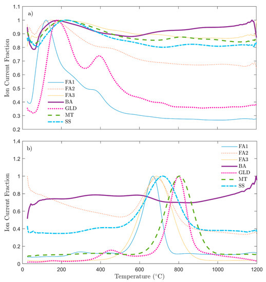 Normalised MS curves of the samples: (a) m/z =18 line (H2O), (b) m/z = 44 line (CO2), FA1 (biomass fly ash 1), FA2 (biomass fly ash 2), FA3 (coal fly ash), BA (bottom ash), GLD (green liquor dregs), MT (coarse limestone tailings) and SS (steel slag).