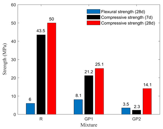 The side stream selection to produce geopolymer composites was determined according to the analysis performed. FA1 was applied as the binder due to its smaller amount of toxic metals compared to the ones present in FA2 and SS. GLD was not applied as filler since they contain a considerable amount of organics and unburnt material. The compressive and flexural strengths of the prepared composites are presented in Figure 6, while the initial setting times and abrasion resistance results are shown in Table 9. Metakaolin-based geopolymer composite (GP1) developed 25.1 MPa of compressive strength and 8.1 MPa flexural strength, whereas they were measured as 50.0 and 6.0 MPa in the case of reference composite after 28 days. The compressive strength of GP2 was measured as 2.3 MPa after 7 days. Despite its significant increase to 14.1 MPa (by 513%) after 28 days, this value is below the minimum requirement for a structural construction material. The drastic increase in the compressive strength of GP2 between 7 and 28 days suggests that the most significant geopolymerisation reactions occur after 7 days, which is different from the strength development of the reference product and GP1, which produce over 80% of the maximum compressive strength in the first 7 days. This retardation may be attributed due to the slower kinetics of aluminosilicates dissolution and polycondensation reactions [18]. The relatively low compressive strength of GP2 may be attributed to the high concentration of calcium in FA1, which is known to reduce the compressive strength of the material by shortening the setting time of the fresh paste so much that the sequential geopolymerisation reactions do not occur appropriately [18]. Even though the maximum compressive strength reached in this study (14.1 MPa) is lower than that obtained in previous studies, see e.g., [6,19,22], the purpose of this work was to prove the applicability of more challenging industrial side streams (biomass fly ash and limestone tailings) with no pre-treatment, rather than aiming at achieving the best mechanical properties. Further improvements can be obtained by reduction of the calcium and iron content, particle size reduction, or by increasing the temperature, and the solution alkalinity. Nevertheless, GP2 can find applications in paving flags (EN 1339) and in concrete kerb units (EN 1340).