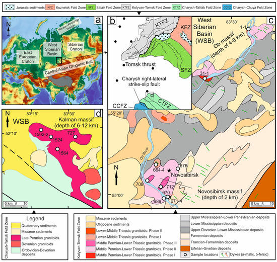 (a) Geographic map of Eurasia showing position and topography of the West Siberian Basin (WSB) (b). Tectonic map of the southeasternWSB showing position of the exposed basement segments and locations of the boreholes that give insight to stratigraphy of the southeastern WSB. (c) Geological position of the Ob and Novosibirsk massif (after [7,8]) and (d) geological position of the Kalman massif (after [7,9]) with indication of sample locations. Depth of “n” km means depth of the massif root according to geophysical data [7].