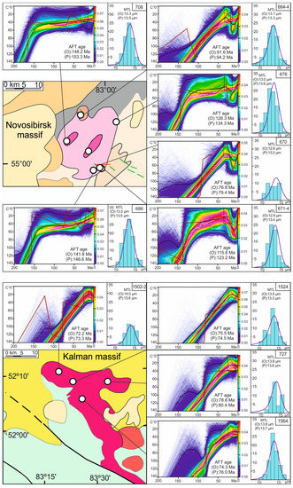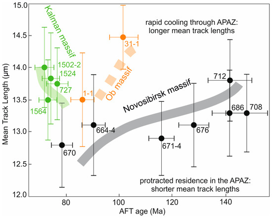 In order to identify periods of tectonic reactivation, the MTL values for each sample were plotted against their corresponding age (Figure 4). This so-called “boomerang plot” [48,49] demonstrates that the basement has likely experienced multiple thermo-tectonic events. For the Novosibirsk massif, only a “half boomerang” segment is displayed, indicating signs of an exhumed fossil APAZ with a Late Jurassic–Early Cretaceous exhumation event (old AFT age and long MTL values) with a tail of mixed signature (shortening within the APAZ) with Late Cretaceous AFT ages and shorter MTL values. We assumed that the Novosibirsk massif rocks with Late Cretaceous AFT ages were affected by a prolonged residence in the APAZ and represent an uplifted/exhumed APAZ. Therefore, in this case, Late Cretaceous AFT ages have no direct geological meaning, but postdate the actual event. Only two AFT ages were obtained for the Ob massif, i.e., 101 and 86 Ma with MTL values of 14.5 and 13.5 µm, respectively. We speculated that the Early Cretaceous AFT age with the MTL value of 14.5 µm dated the exhumation event, while the Late Cretaceous AFT age with shorter lengths showed an age value mixed with a younger event. In the case of the Kalman massif, a “half boomerang” segment was characterized by slightly increasing AFT ages (from 71 to 81 Ma) with decreasing MTL values (from 14.0 to 13.5 µm). This may indicate that the granitic rocks of the Kalman massif have recorded a relatively young (Late Cretaceous) exhumation event after a prolonged residence in the APAZ or in even deeper zones of the upper crust, which led to significant annealing of the signatures of an older (e.g., Early Cretaceous) exhumation event.