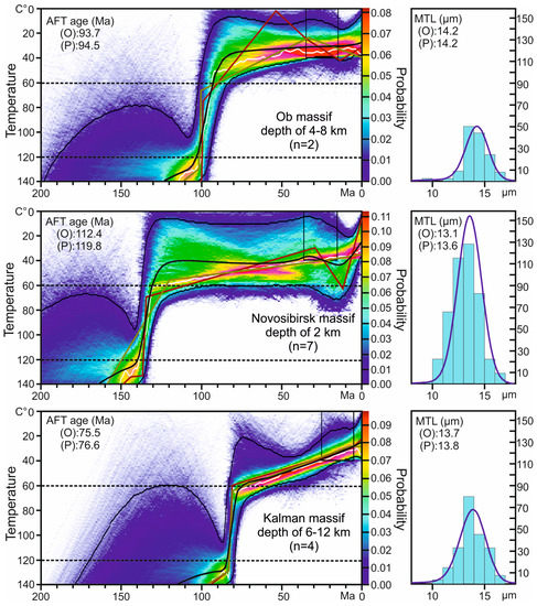 AFT thermal history model results for the Ob, Novosibirsk, and Kalman massifs produced by the QTQt software [44] combining n samples. Thermal history models are presented in a fixed time-temperature interval of 0–140 °C and 200–0 Ma. The color scale indicates high probability for red and yellow, and the blue colors indicate low probability values (see the caption of Figure 3 for further clarification).
