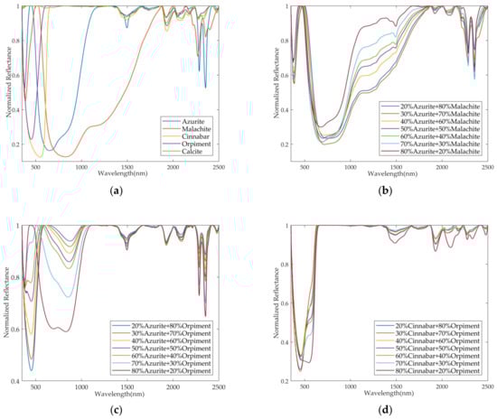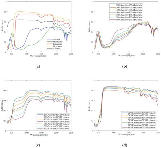 Spectra of pure pigments and mixed pigments in different mass ratios: (a) pure pigment spectra; (b) azurite and malachite mixed spectra; (c) azurite and orpiment mixed spectra; (d) cinnabar and orpiment mixed spectra; (e) cinnabar and calcite mixed spectra; (f) orpiment and calcite mixed spectra.