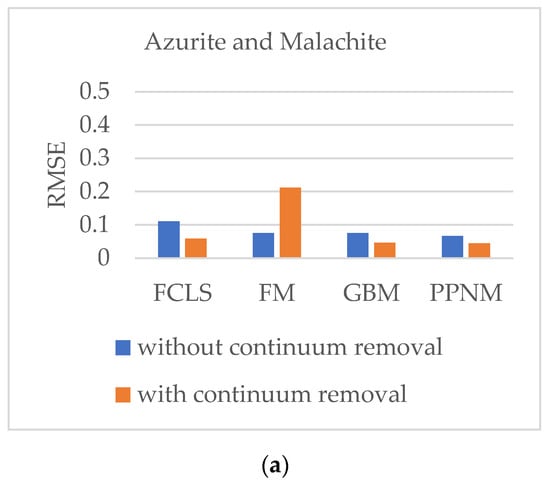 The comparison of the RMSE values of four algorithms in different mixtures with and without continuum removal: (a) azurite and malachite; (b) azurite and orpiment; (c) cinnabar and orpiment; (d) cinnabar and calcite; (e) orpiment and calcite.