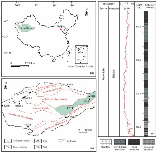 Geological overview of the Tarim Basin and of the study area: (a) the location of the Tarim Basin [13]; (b) tectonic units of the Tarim Basin and location of the study area [13]; (c) stratigraphic column of the Ordovician Heituao formation in the Tadong low uplift. Where GR stands for the natural gamma ray logging and API is the unit of GR.