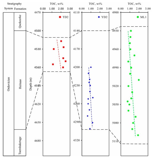 Vertical trends of the TOC content of different wells (TD2, YD2, and ML1) from Heituao shale samples in Tadong low uplift.