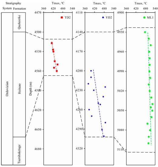 Vertical trends of the Tmax content of different wells (TD2, YD2, and ML1) from Heituao shale samples in Tadong low uplift.