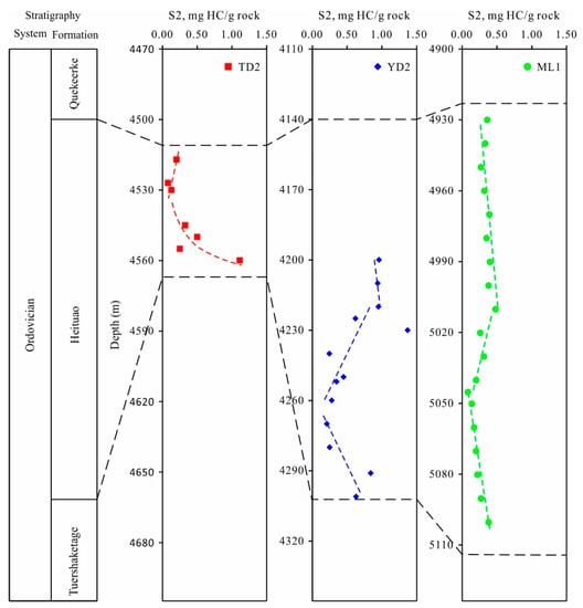Vertical trends of the S2 content of different wells (TD2, YD2, and ML1) from Heituao shale samples in Tadong low uplift.