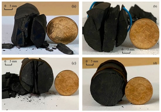 Followed by porosity and permeability test, four shale core columns were used to carry out uniaxial compression experiments [32]. The results (Table 4) show that the Young’s modulus of the Heituao shale in the study area ranges from 20.0 to 23.1 GPa with an average of 21.2 GPa, and the Poisson’s ratio ranges between 0.11 and 0.21 with an average of 0.15. This shows that the mechanical properties of Heituao shale have the characteristics of high elastic modulus and low Poisson’s ratio, which is conducive to hydraulic fracturing. In addition, through the observation of the sample morphology after the uniaxial compression tests (Figure 6), it is found that the shale samples are penetrated by cracks perpendicular to the direction of the maximum principal stress, and the crack surface is smooth and straight. The high elastic modulus, low Poisson’s ratio, long-straight crack formation and high contents of brittle minerals of the shale samples have a good corresponding relationship to indicate a perfect fracturing potential of the Heituao shale in the study area.