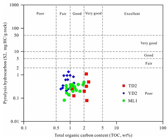 The abundance of organic matter is one of the main factors affecting the hydrocarbon generation intensity of source rocks [33]. Organic matter not only provides the material basis for gas generation, but also serves as the carrier for adsorbed gas which has a close positive correlation with the gas content of shale [1,18]. In addition, the distribution of the TOC versus S2 for the Heituao shale based on a plot [34] was analyzed to reveal the organic matter abundance of Heituao shale in the study area (Figure 7). It indicated that all of the samples can be regarded as having ‘‘poor’’ generative potential, with TOC values ranging from 0.63 to 2.51 wt% (average = 1.22 wt%) and S2 values ranging from 0.08 to 1.37 mg HC/g rock (average = 0.42 mg HC/g rock). Although the TOC values are at a high level, the low S2 values reduce the hydrocarbon generation potential of shale samples, that is to say, the “poor” generative potential mainly results from the S2 values of Heituao shale.