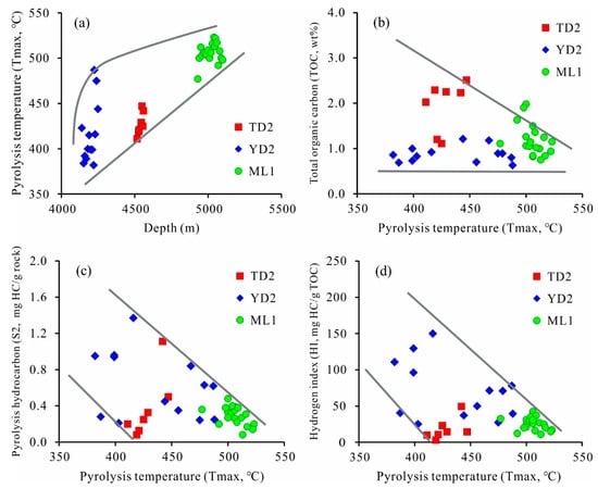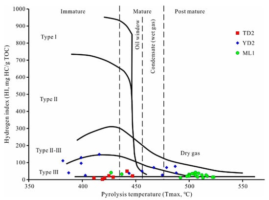 Moreover, the thermal maturity of organic matter of Heituao shale in the study area was evaluated based on the Tmax values in Figure 8. It indicated that the maturity of Heituao shale varies from immature to post mature, and there exists great difference between different wells which result from different depth (Figure 8a): the shale in well ML1 has experienced post mature with the Tmax values ranging from 477 to 523 °C with an average of 506 °C, that in well YD2 are immature stage maturity with the Tmax values ranging between 382 and 488 °C (average = 437 °C), that in well TD2 are from immature to post mature stage (ranges from 411 to 447 °C, with an average of 428 °C).