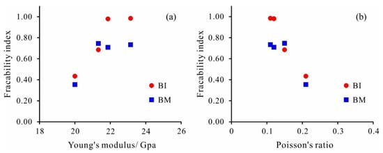 In addition, by comparing BI and BM values (Figure 10), it is found that BI value is slightly higher than BM value, and there is a certain positive correlation between them. Moreover, it shows that BI and BM values have a good positive correlation with the Young’s modulus, and a good negative correlation with the Poisson’s ratio of shale samples. With the increase of Young’s modulus and the decrease of Poisson’s ratio, BI and BM values show an increasing trend, which shows the feasibility and accuracy of evaluating the fracability of Heituao shale in the study area through these two parameters.