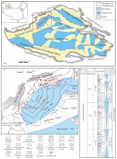 (a) Map of the Junggar Basin in China. (b) The division of tectonic units in the Junggar Basin and the location of the Mahu scheme. (c) The division of sub-tectonic units and thickness contour of Fengcheng Formation in Mahu Sag. (d) Lithology and sedimentary facies profile of the Fengcheng Formation in the Mahu Sag, modified after [].