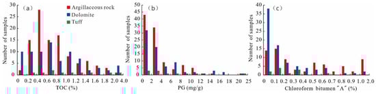 Distribution histograms of organic matter abundance in the Fengcheng Formation in the Mahu Sag. (a) Histogram of TOC distribution. (b) Histogram of PG distribution. (c) Histogram of chloroform bitumen “A” distribution.