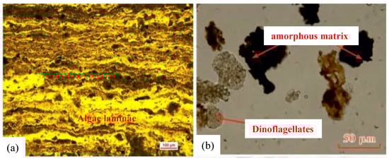 Hydrocarbon-generating parent material composition of source rocks of the Fengcheng Formation in Mahu Sag. (a) Well Fn 8, 3596 m P1f, Algae laminae under UV fluorescence. (b) Well Fc 011, 3163 m P1f, Dinoflagellates and amorphous matrix under plane-polarized light.