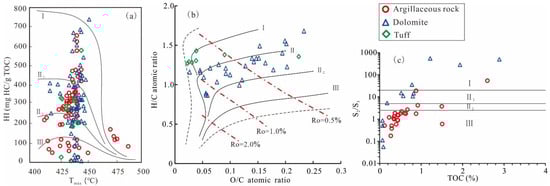 From the relationship between the organic matter type index (S2/S3) and TOC (Figure 4c), the organic matter type improves with increasing TOC. Argillaceous rocks are mainly distributed in the type III region, but when the TOC value is greater than 1%, organic matter is mainly type II; dolomite is mainly type II and type I, and when the TOC value is greater than 1%, dolomite is mainly type I. The low values of S2/S3 observed here for the argillaceous rocks are an artefact of the matrix effect []. The three methods used to determine the organic matter type of the Fengcheng Formation in the Mahu Sag indicate that the organic matter was mainly oil-prone type II, followed by types I and III, indicating the diversity of organic matter sources.