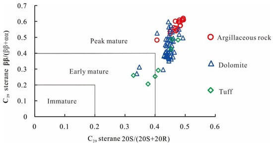Vitrinite reflectance (Ro) is the most widely used optical parameter in the determination of the rank of coals and the maturation levels of other lithologies in sedimentary basins [,,]. The measured Ro in the source rocks of the Fengcheng Formation is distributed between 0.56% and 1.14%, with an average of 0.80% (Table 1), reaching the stage of mature evolution. The maturity reflected by the Tmax of argillaceous rocks, dolomites, and tuffs is basically the same, and the average value is above 435 °C, also reaching the stage of mature evolution. The maturity reflected by Ro and Tmax is consistent with that reflected by biomarker parameters C29 sterane 20S/(20S + 20R) and C29 sterane ββ/(ββ + αα) (Figure 5). The measured data show that the source rocks of the Fengcheng Formation have reached the stage of mature evolution on the whole, but a few samples are still in the stage of low maturity, and their burial depth is less than 3500 m (Figure 5).