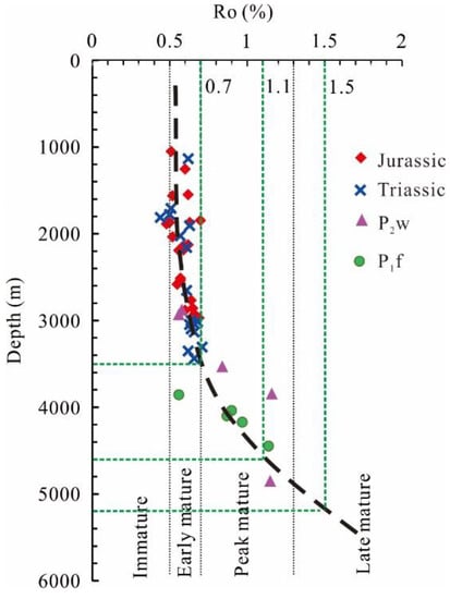 Because the Ro test samples were mainly taken from the Wu-Xia fault zone and the Zhongguai Uplift adjacent to the Mahu Sag, the thickness of the Fengcheng Formation is approximately only 400 m, while the thickness of the Fengcheng Formation in the sedimentary centre of the Mahu Sag can reach 800–1800 m []. Therefore, the measured Ro in the Fengcheng Formation cannot reflect the overall thermal evolution degree of the Mahu Sag. For that reason, we collected the measured Ro data of Jurassic rocks, Triassic rocks, and the Permian Wuerhe Formation (P2w) from the Mahu Sag and its surrounding structural belt, and plotted their changes with depth (Figure 6). With increasing burial depth, Ro increases, and burial depth and Ro have a good correlation, indicating that the changes in Ro are mainly controlled by the normal geothermal evolution history. Thus, the Ro trend line with burial depth can be used to predict the thermal evolution history of the source rocks of the Fengcheng Formation in the Mahu Sag.