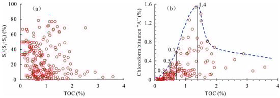 (a) Relationship between TOC and productivity index S1/(S1 + S2) of source rocks in the Fengcheng Formation. (b) Relationship between TOC and chloroform bitumen “A” of source rocks in the Fengcheng Formation.