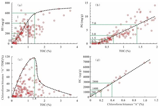 In the TOC and HI diagram (Figure 8a), the limits of HI can be divided into five sections depending on the type of organic matter. When the TOC content is less than 1%, TOC and HI have a positive relationship. The mean value of the corresponding TOC content in each HI interval is taken as the TOC limit of different grades; accordingly, the TOC limit value of non-source rocks was determined to be 0.3%, that of poor source rocks to be 0.3–0.5%, and that of fair source rocks to be 0.5–0.7%. When the TOC content is greater than 1.4%, the organic matter is type I, and the rocks are composed of excellent hydrocarbon source rocks; the range of 0.7–1.4% is representative of good source rocks. Subsequently, the source rock evaluation standards (Table 2) were established according to the series of relationship diagrams of TOC and PG (Figure 8b), TOC and chloroform bitumen “A” (Figure 7b), TOC and chloroform bitumen “A”/TOC (Figure 8c), and chloroform bitumen “A” and HC (Figure 8d).