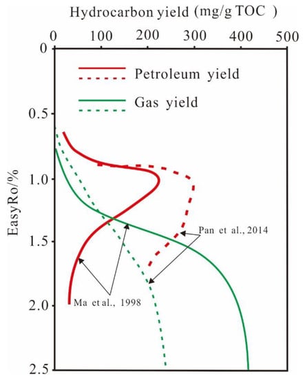Ma et al. [] established a hydrocarbon generation model of the source rock of the Permian Fengcheng Formation in the Junggar Basin (Figure 9) by using the experimental method of high-pressure kettle water addition simulation. It was proposed that Ro was 0.7–1.5% at the main oil generation stage; when Ro of 1.0% was the peak, the maximum oil generation was 220 mg/g TOC. When Ro reaches approximately 2.5%, the peak of gas production is reached, which is mainly crude pyrolysis gas. Pan et al. [] studied samples from the FN 1 well in the Fengcheng Formation (the burial depth is 4096.44 m, TOC is 1.82%, hydrocarbon yield is 506 mg/g TOC, Tmax is 440 °C) as an example, and their simulation showed that when Ro was 1.0% at the peak oil source, the maximum oil generation was 300 mg/g TOC, Ro was still in a large oil generation stage when it was 1.5%, and Ro corresponding to the gas peak was 2.3%. The thermal simulation results show that the source rocks of the Fengcheng Formation have the characteristics of continuous oil generation, and a one-stage oil peak and large hydrocarbon generation occur.