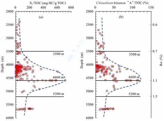 Relationship between hydrocarbon generation conversion rate and burial depth of source rocks in the Fengcheng Formation, Mahu Sag. (a) S1/TOC varies with depth and Ro to determine the main oil generation stage. (b) Chloroform bitumen “A”/TOC varies with depth and Ro to determine the main oil generation stage.