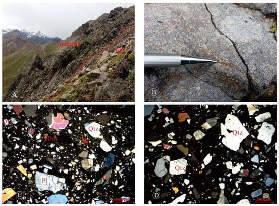 Macroscopic and microscopic images of the rocks of Zongdangcun Formation. (A) The boundary between tuffs and andesites; (B) Crystal-vitreous tuff outcrop of Zongdangcun Formation; (C,D) Photomicrographs of the sample at PM-20 and PM-21. Qtz: quartz, Pl: plagioclase, Bt: biotite, Hbl: hornblende.