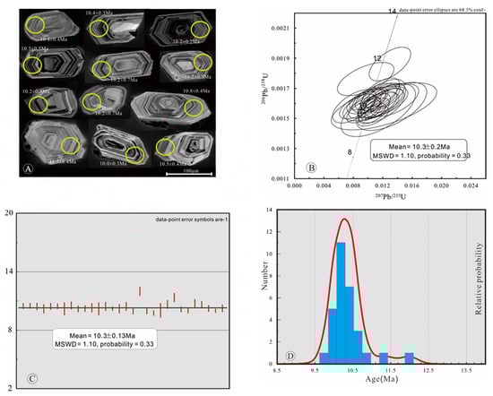 Zircon grains from one sample (PM21-Bb5) were selected for LA-ICP-MS U-Pb dating and zircon CL image acquisition. The CL images of zircon show a single color; most zircons are colorless and transparent, and the particles are euhedral-subhedra granular or columnar, with good crystallinity (Figure 3A). The cathodoluminescence image shows clear oscillatory zoning in zircon, which is typical in igneous zircons [54,55]. The Th content in zircon is within 252–2192 ppm, and the U content is within 664–2755 ppm. There is a significant positive correlation between the two, and the Th/U ratio is between 0.18 and 2.46, which is much higher than values of metamorphic zircon (generally <0.1), and within the range of magmatic zircon [56,57]. In this experiment, 40 zircon crystals were selected from tuff sample, and the U-Pb isotopic of zircon results are shown in Table 1. The 40 zircon samples have good concordance in the U-Pb concordia diagrams. The age distribution of zircons is relatively concentrated and evenly distributed on or near the concordia curve. The results show that the U-Pb system was in a closed system after the formation of zircons, and the dating results can represent the crystallization age of the rocks. The 206Pb/238U age span of 40 zircon samples is within a small range of 9.8–10.6 Ma, and the weighted average age is 10.3 ± 0.2a (n = 40, MSWD = 1.10).