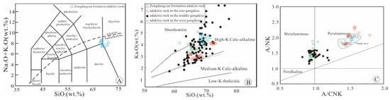 (A) TAS classification diagram [60]. (B) SiO2- K2O plot for tuff [59]. (C) A/CNKvs. A/NK diagram [58] Data from [11,12,19,44,61].