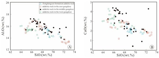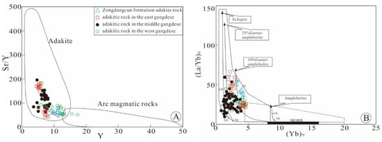 (A) Diagrams showing the relationships of Sr/Y vs. Y [66]; (B) (La/Yb)N vs. YbN [68] for Miocene magmatic rocks from Gangdese batholith, data from the same source as Figure 4.