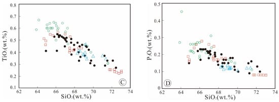 The compositional data show that felsic rocks of the Zongdangcun Formation are peraluminous [58], its A/CNK ratio (1.42–1.80) is greater than 1 (Figure 4C), and its SiO2 content is 68.41–71.37wt%. The K2O content is relatively high and distributed between 3.95 and 4.87wt%, and the samples plot into the high-potassium calcium-alkaline series [59]. The distribution range of the Rittman index σ of the sample is 1.93–2.88 < 3.3, reflecting the characteristics of calc-alkaline magmatism. The content of MgO is low (0.50–0.69 wt.%); Mg# is less than 43.92. The samples are low in TFe2O3 (less than 2.38 wt.%) and low-concentration compatible elements (Cr = 15.22–24.71 ppm; Ni = 5.33–6.49 ppm) (Table 2). The content of Al2O3, CaO, TiO2, and P2O5 decrease with the increase of SiO2 contents (Figure 5A–D), indicating that magma differentiation. In the TAS diagram, the studied samples plot into the range of rhyolite and dacite (Figure 4A) [60], which is consistent with petrography and generally have high contents of silicon, potassium, but low contents of calcium and magnesium.