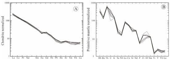 (A) Chondrite-normalized rare earth element diagrams; (B) Primitive mantle-normalized element spider diagram. Normalizing values from [67].