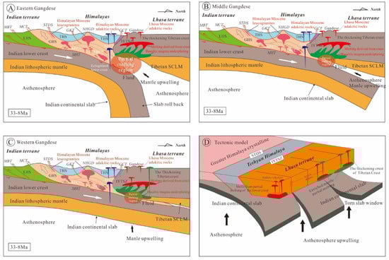 At present, the more meaningful dynamic models for simulating post-collisional magmatism in the Gangdese [44,93,108] mainly include lithospheric mantle convective thinning [44,93] and Indian plate rotation/disconnection [116,120]. In this period, there is a lack of massive basic magmatism in the study area [3,37,45,47], so the mantle plume model is usually not used as the tectonic origin of post-collisional magmatism in the Gangdese belt. The lithospheric convective thinning model emphasizes that the lithospheric mantle is gravitationally unstable due to the shortening of the Cenozoic crust and uniform thickening. Part of the continental lithospheric mantle is replaced by the upwelling asthenosphere, which provides heat for the partial melting of the lithospheric mantle and lower crust and is accompanied by surface uplift. The Indian plate rotation/detachment model suggests that plate rotation/detachment caused the upwelling of asthenospheric material in the lower part of the Indian lithosphere, which led to the melting of the lithospheric mantle in the lower part of the Tibetan Plateau. However, it is difficult to explain both the N-S rift system caused by the E-W extension and the E-W distribution of the post-collisional magmatic rocks in the Gangdese belt [50]. Integrating post-collisional magmatism and its relationship with the north-south rift system [121], combined with the geophysical data of the east-west subduction angle of the Indian subducting plate in the Gangdese zone [24], a model simulating the tearing and segmented subduction of the Indian plate front is proposed (Figure 12).