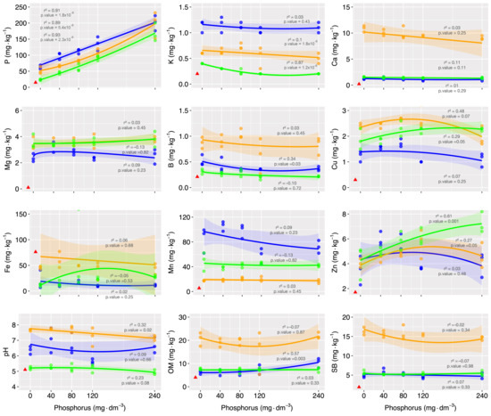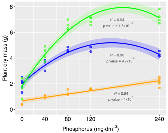All variables were normally distributed, as confirmed by the Shapiro-Wilk test, and were compared by analysis of variance. When a significant difference was observed, the individual means were compared by the Scott-Knott test (p < 0.05). The variables were also subjected to regression analysis as a function of P dose and were compared by significance levels. Statistical analysis was performed in the R environment, version 3.2.4 [28]. Principal component analysis of the nutrient contents in the plant parts was performed in scaled and normalized form using the “prcomp” function of the “vegan” package.
