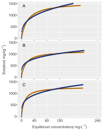 The parameters of the Langmuir and Freundlich isotherms were estimated by linearization of the hyperbolic model according to Alvarez and Fonseca [27]. With the data obtained, the adsorption isotherms were plotted and fitted to hyperbolic models given by Equations (1) and (2):