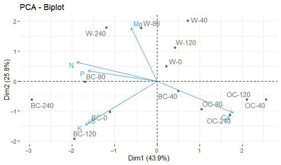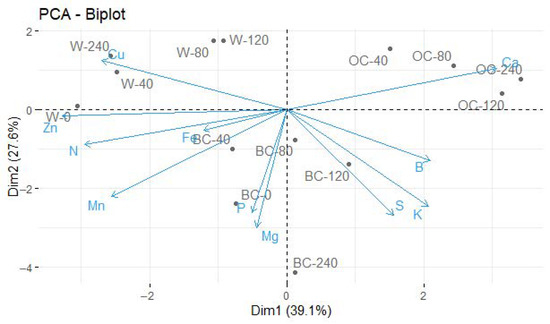 Principal component analysis of the macro- and micronutrient contents in the shoots of D. apurensis as a function of P dose in waste without organic amendments (W), with biochar (BC), and with organic compost (OC).