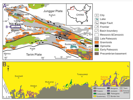 (A) Tectonic location of the Yili Basin with Paleozoic tectonic features; (B) Geological map of the southern Yili Basin (redrawn from [39]).