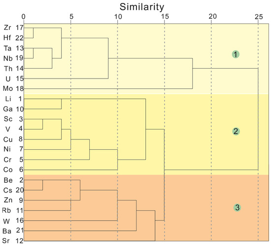 The concentrations of trace elements in sediments are mainly controlled by terrigenous and/or by sedimentary and diagenesis processes and by some unknown factors [49]. A multivariate statistical method was applied to distinguish these complex effects, factors and processes. The Pearson correlation for cluster analysis of the 22 trace elements yielded 3 main categories (Figure 3), which could be applied to demonstrate the similarities and differences of elements [50,51].